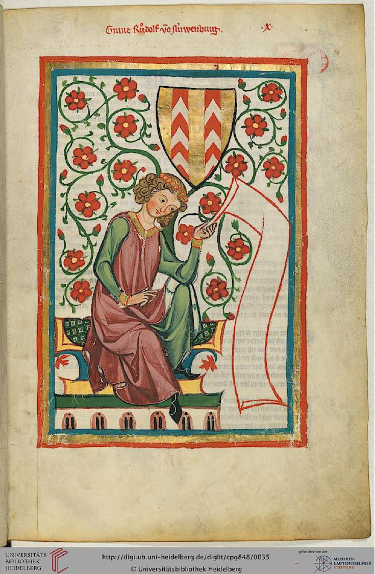 The illustration shows Count Rudolf of Neuenburg, a Swiss noble, living around 1200. It is not a portrait in a modern sense. Notice that the illumination marks him as a poet by showing him talking – most likely about love, since he is sitting in a rose garden.